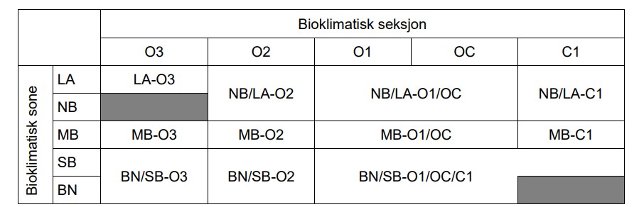 Here we prepare a custom version of the bio-climatic regions of Norway (Bakkestuen et al. 2008). The regions are made up of the different combinations of zones and sections. This yields 23 unique types. For our purpose we want to combine some regions, and we therefore end up with 11 types (Figure 3.1) The data is in 1km^2 vector squares an there is a column called ´SSBID´ which refers to the SSB1000 grid.