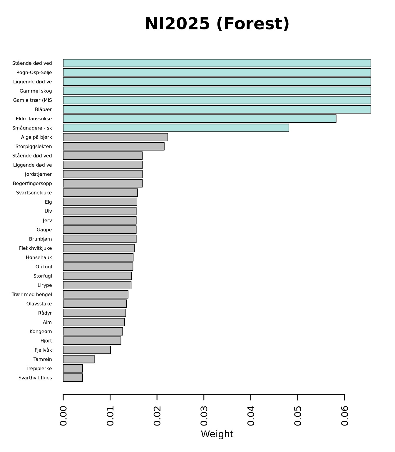 For NI2025, the top 35 indicator weights for ecosystem Forest are attributed as shown below. Note that blue bars represent the key indicators, while grey bars are “normal” (= non-key) indicators.