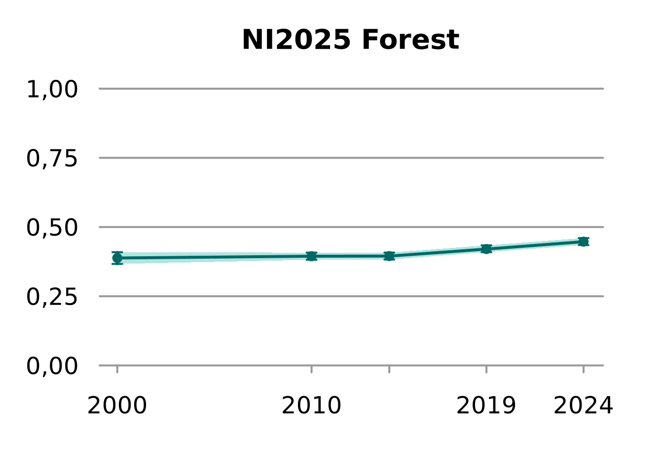 The Nature Index (NI) is calculated as a weighted mean of a range of different indicators. Each indicator is first scaled with respect to its reference value such that it takes on values between 0 and 1, where 0 corresponds to a species (group)/habitat type being extinct/completely lost, and 1 corresponds to an abundance of a species /group)/habitat type as we would expect it in an ecosystem with as little as possible human disturbance. In the case of semi-natural ecosystems, value 1 represents the indicator state in a well-managed ecosystem. After scaling, each indicator is assigned a composite weight that is dependent on trophic group, relative area for which data are available, and key indicator status. In early versions of NI, ecosystem fidelity (given as % of the indicator distributed across different ecosystems) was also used for assigning weights; however, as of NI2020, this is no longer done as there is no reason to down-weigh an indicator in ecosystem A just because it also appears in ecosystem B. NI for a given ecosystem is the calculated as a weighted average of all relevant indicators. For more information on the Nature Index framework, please refer to the sources provided in Chapter XX: “Links and references”.