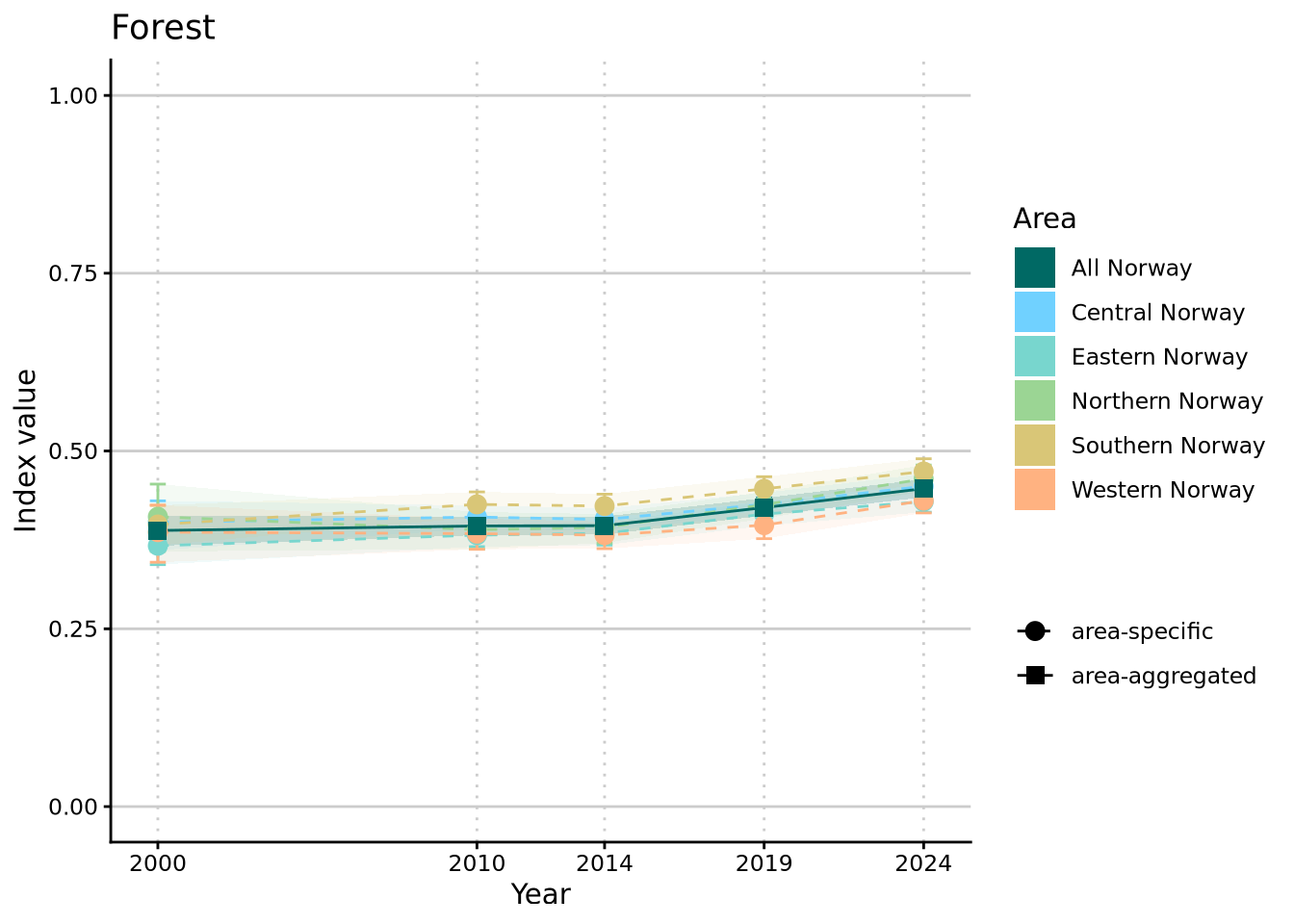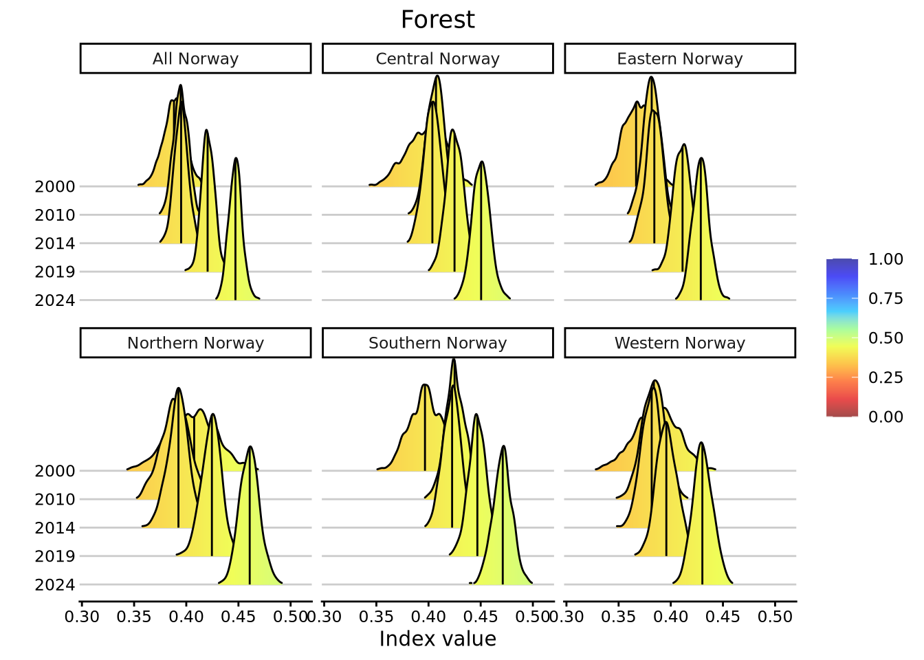 Before proceeding, we first need to combine our index values with corresponding geospatial data. The latter is contained in shapefiles archived on NINA’s internatal data systems under “P:/412430_naturindeks/Beregninger/Shapefiles”. The shapefiles are derived from spatial data stored in the NI database; if you are in need of access to these shapefiles, please contact the NI core team at NINA (naturindeks@nina.no) or the database administrator (siw.berge@nina.no).