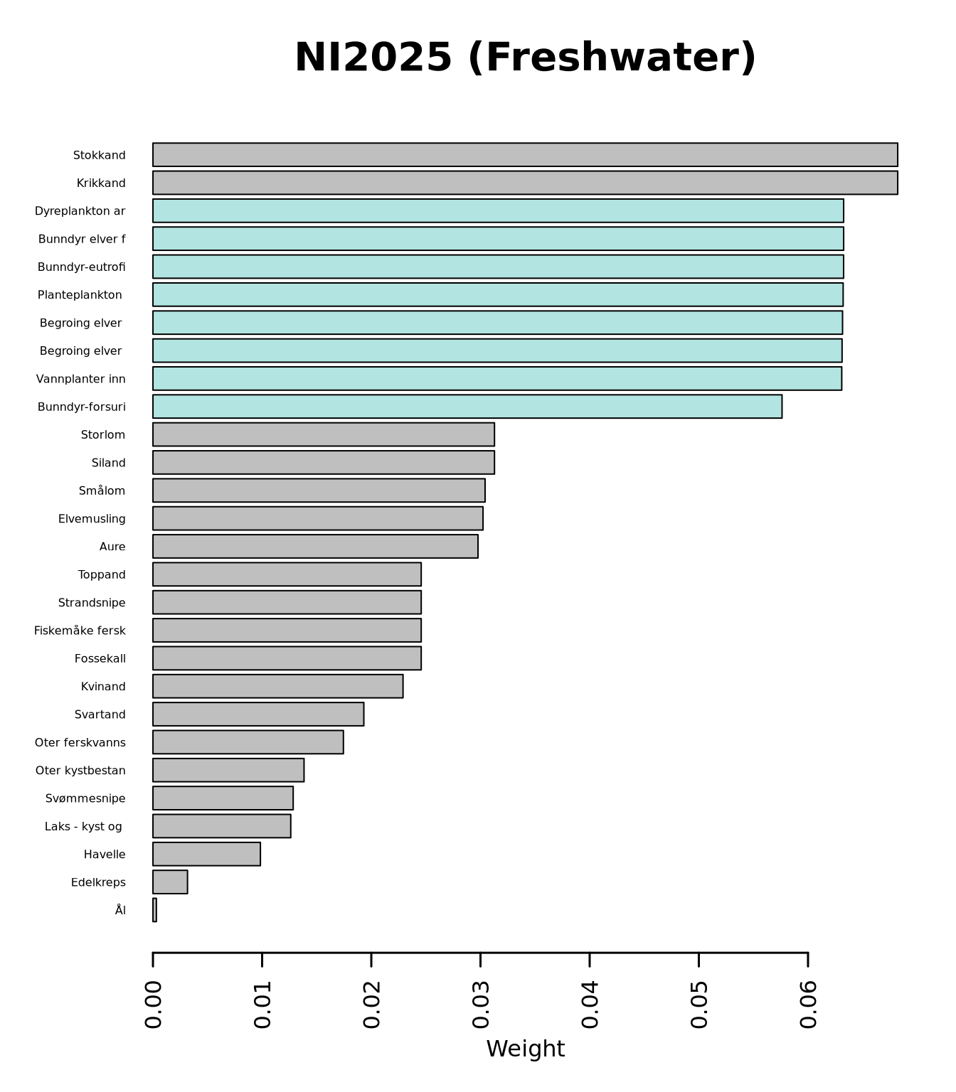 For NI2025, the top 35 indicator weights for ecosystem Freshwater are attributed as shown below. Note that blue bars represent the key indicators, while grey bars are “normal” (= non-key) indicators.