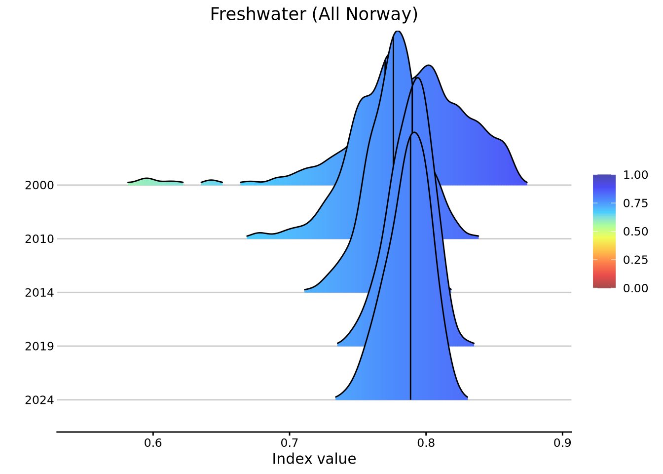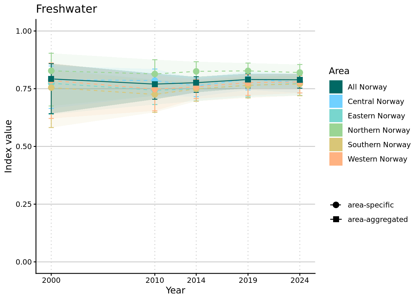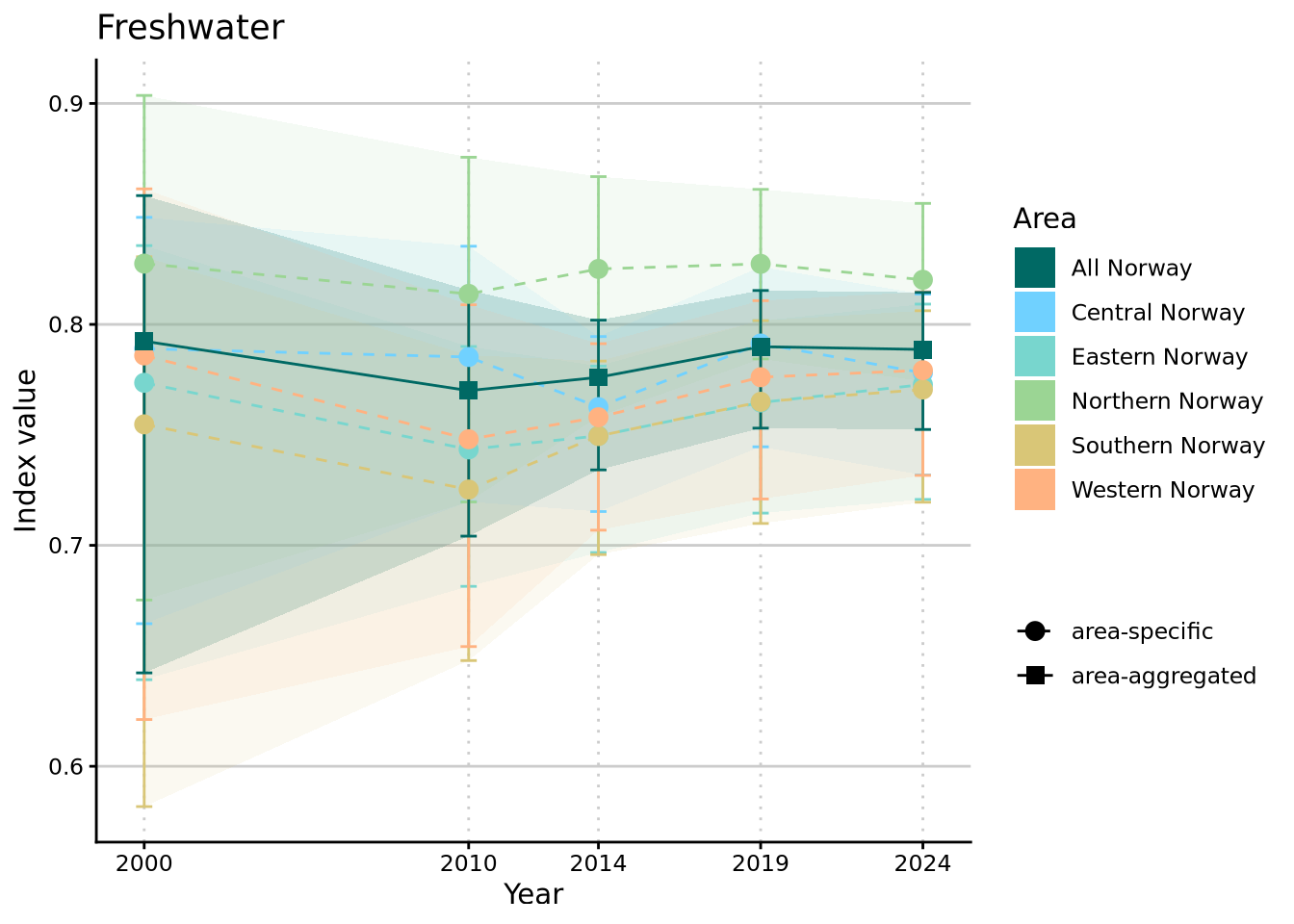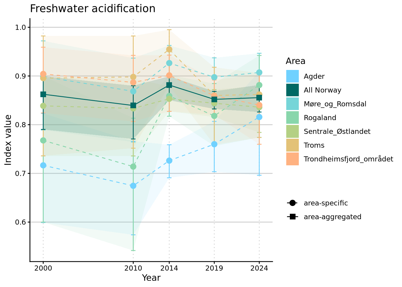 As of NI2025, all previously published thematic indices have been discontinued. We have, however, had a request to provide the thematic indices for “Forsuring ferskvann” (= freshwater acidification) and “Eutrofiering ferskvann” (= freshwater eutrophication) as tools to aid with interpretation of NI for freshwater ecosystems.