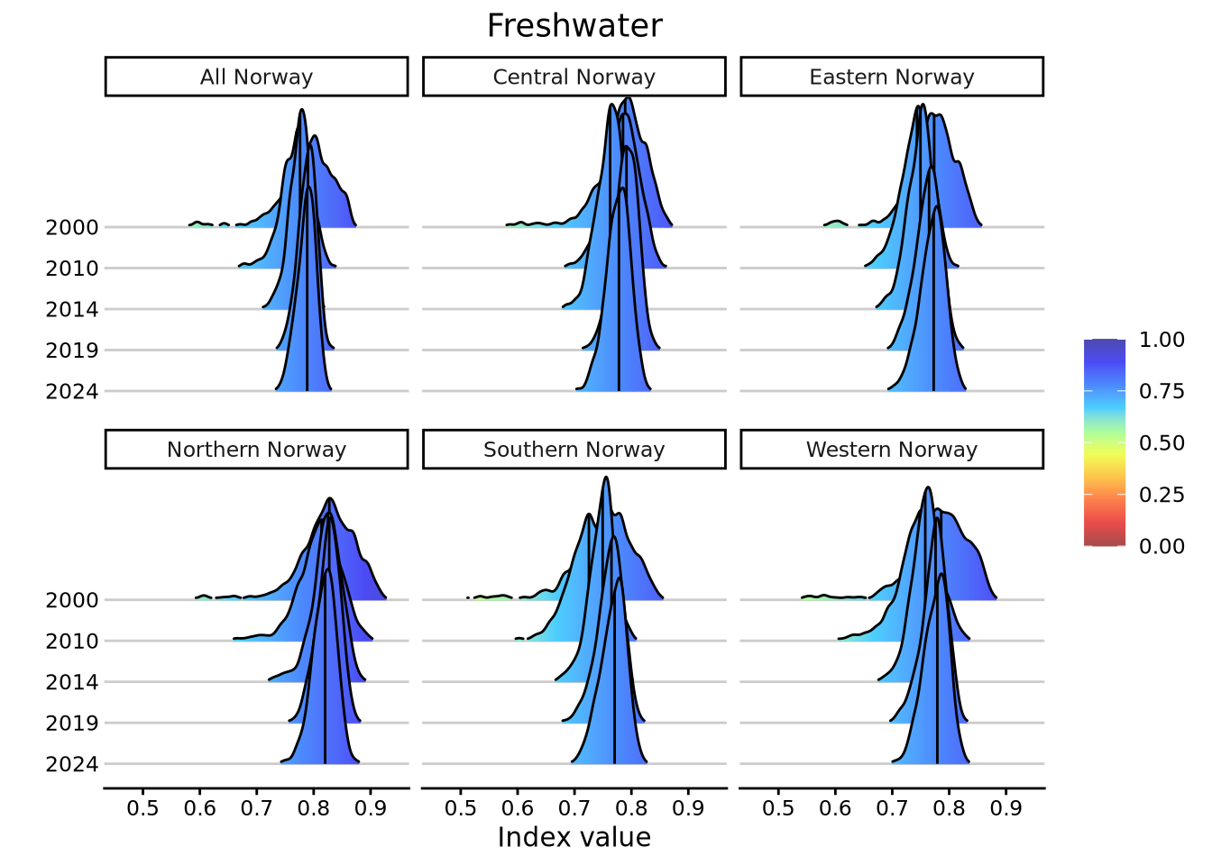 Time-series graphs of complete values distributions for the area-aggregated means and for each of the five major regions of Norway