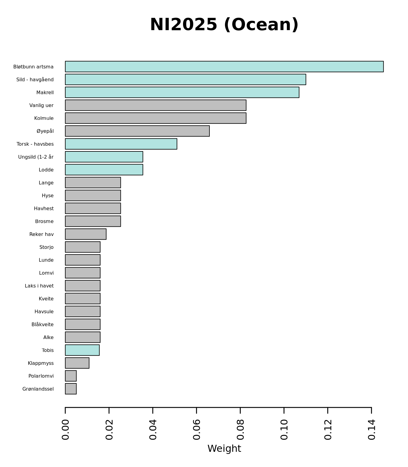 For NI2025, the top 35 indicator weights for ecosystem Ocean are attributed as shown below. Note that blue bars represent the key indicators, while grey bars are “normal” (= non-key) indicators.