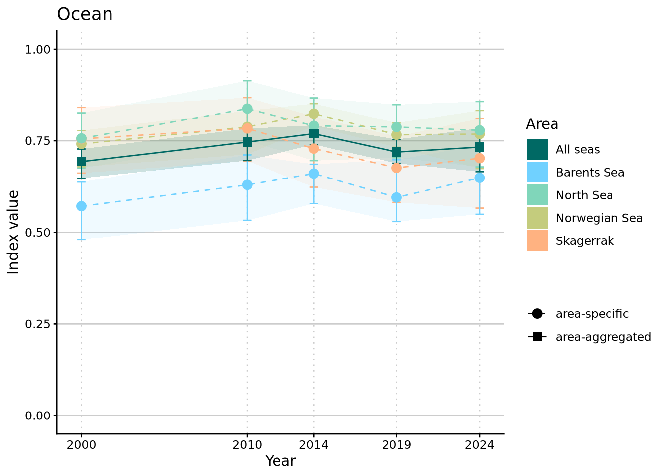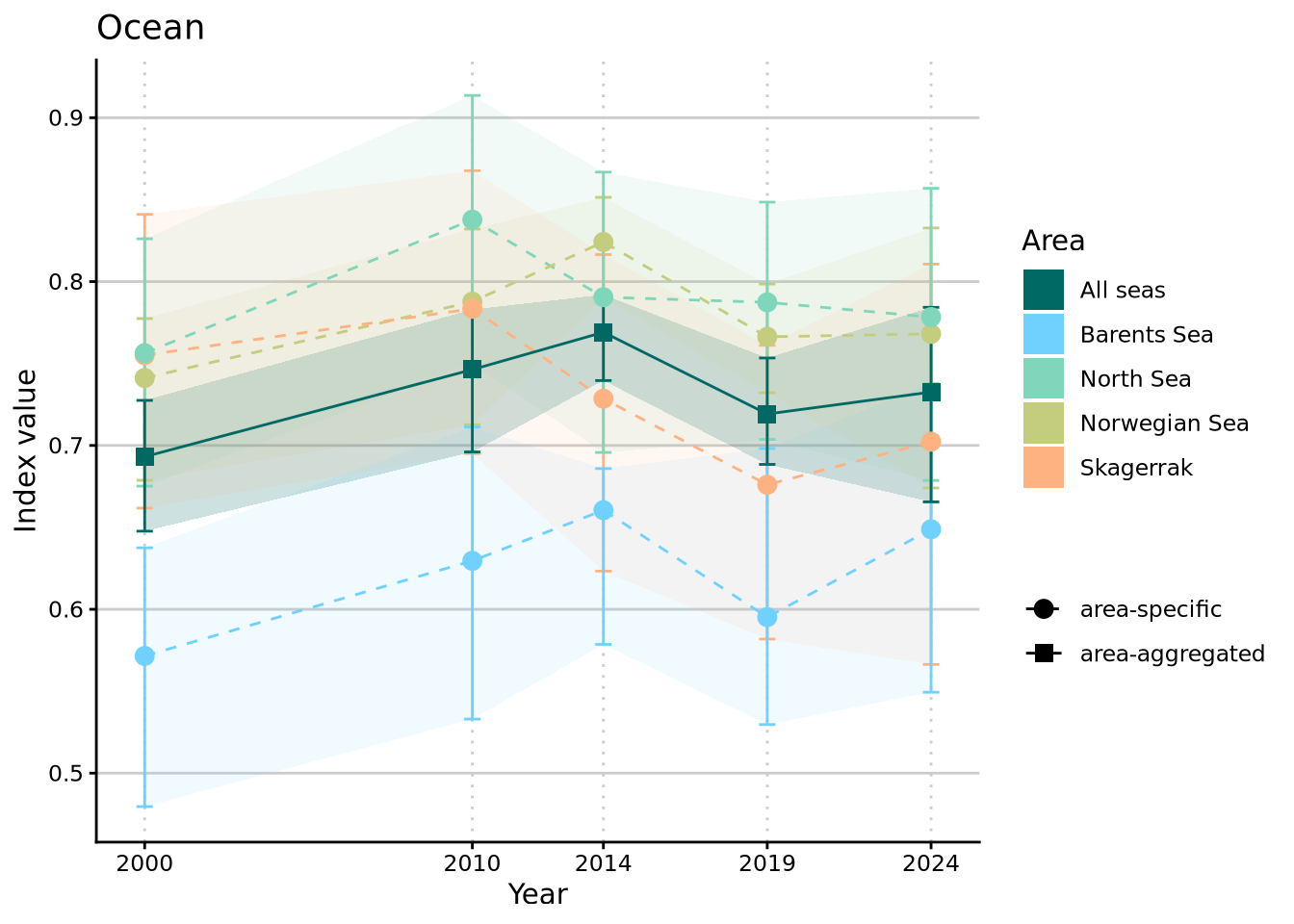 Indicators are assigned weights (= contributions to NI) based on their functional group (trophic weight), the relative extent of area for which data is available (area weight), and whether or not they are considered key indicators (all key indicators together are given 50% of the total weight in NI calculations).