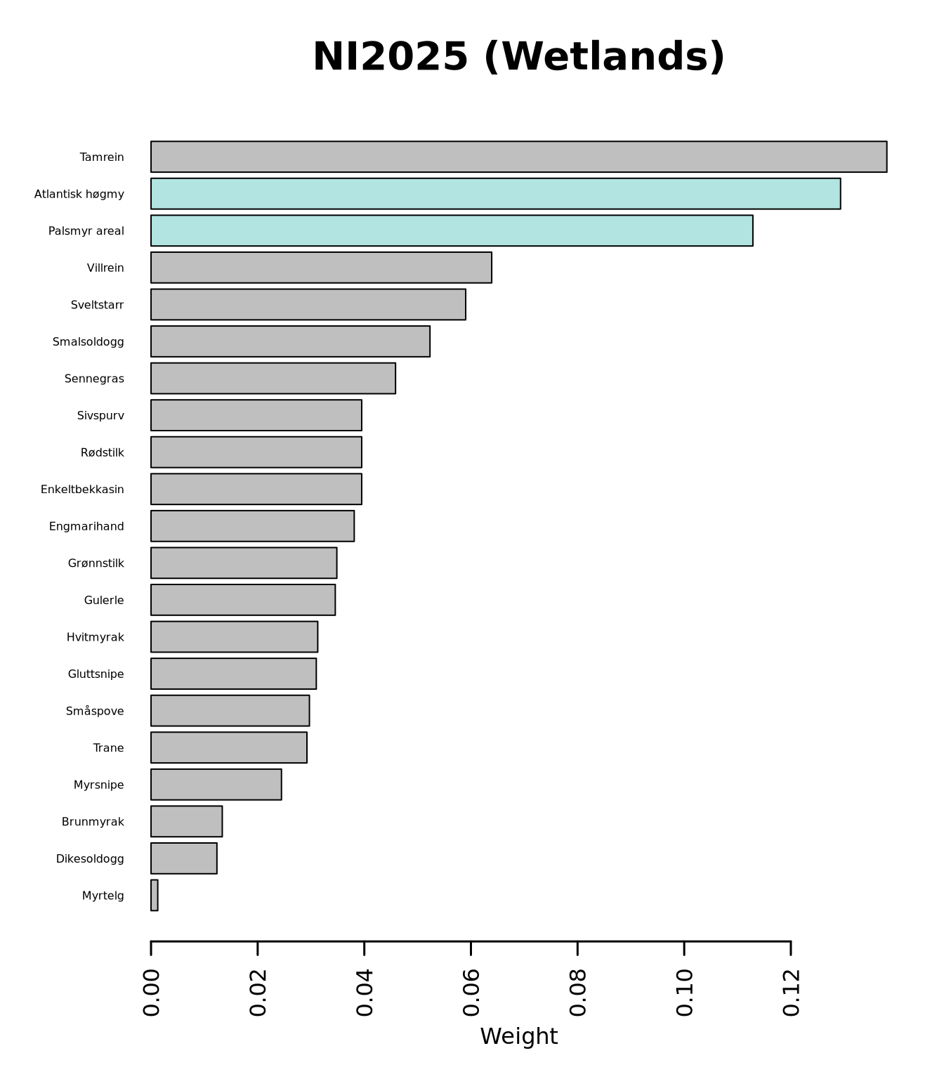For NI2025, the top 35 indicator weights for ecosystem Wetlands are attributed as shown below. Note that blue bars represent the key indicators, while grey bars are “normal” (= non-key) indicators.