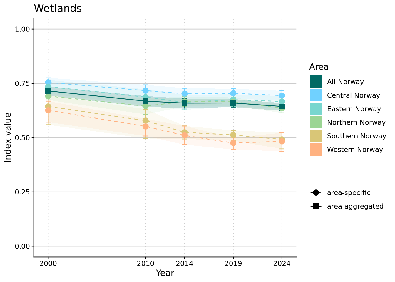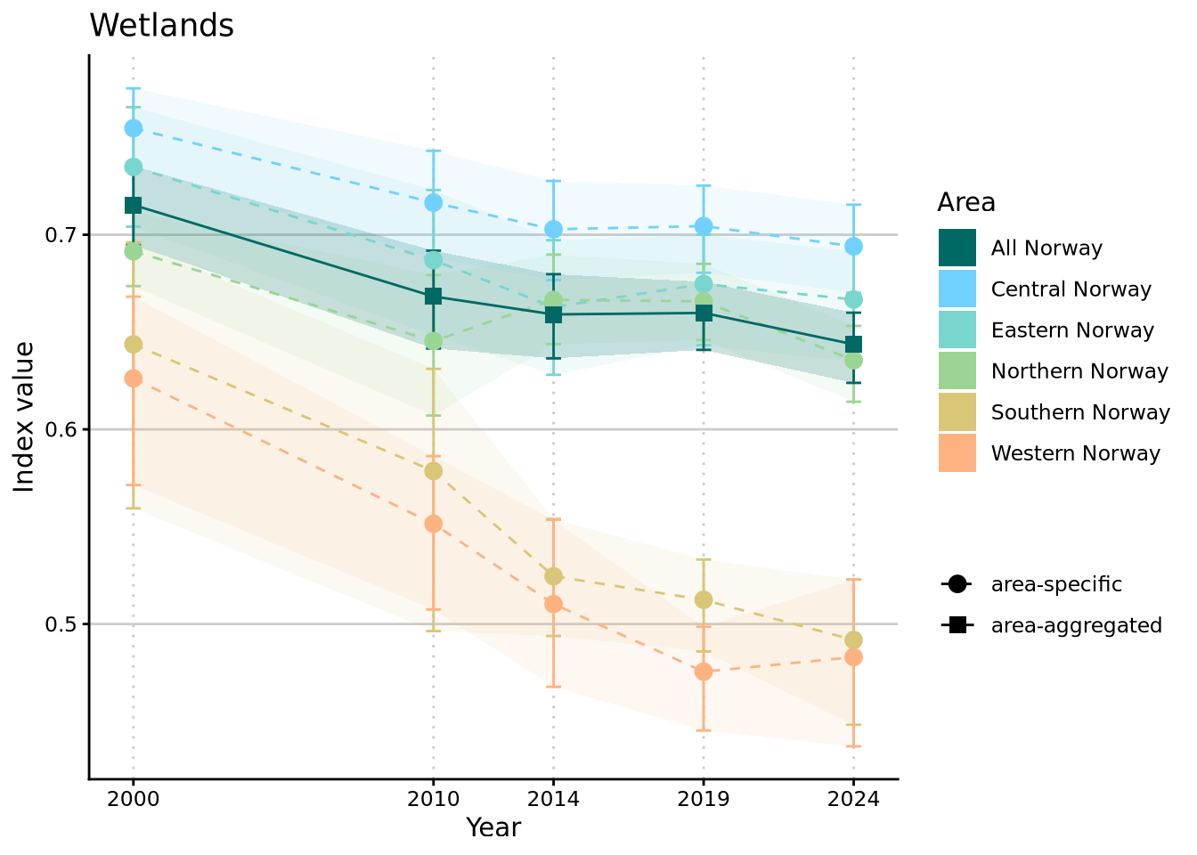 Time-series graphs of medians and 95% confidence intervals, for the area-aggregated mean as before but also including values for each of the five major regions of Norway