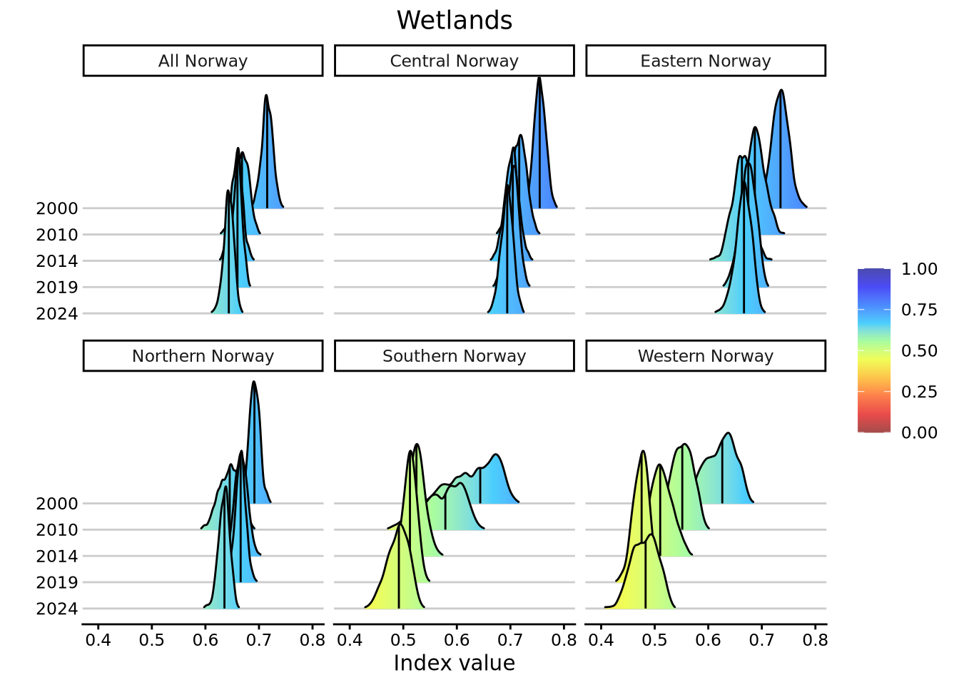 Time-series graphs of complete values distributions for the area-aggregated means and for each of the five major regions of Norway