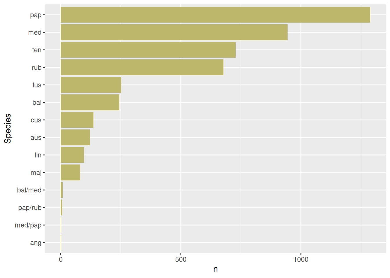 )I’m pretty sure this has worked, since I tried in on the synthetic data, but there are just four cases of the species being different across the aggregated strata (mainly this would imply that there had been a species change during the growing season).