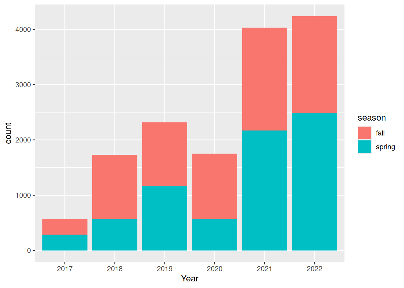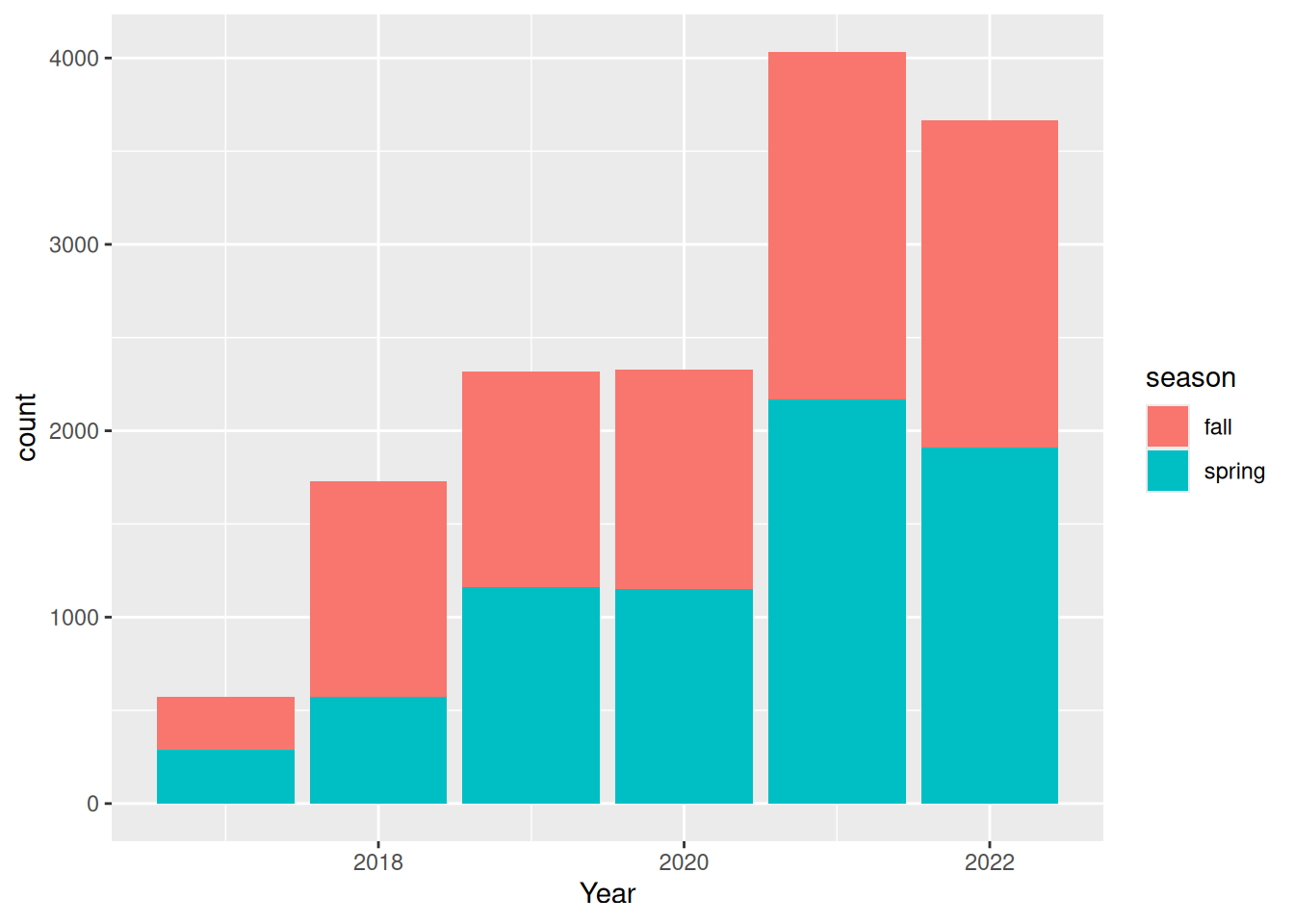 rm(dat_fall, dat_spring)The long data is 14641 rows. This is too much to display as an html table on this web site, but here is a random sample of 50 rows just to illustrate.