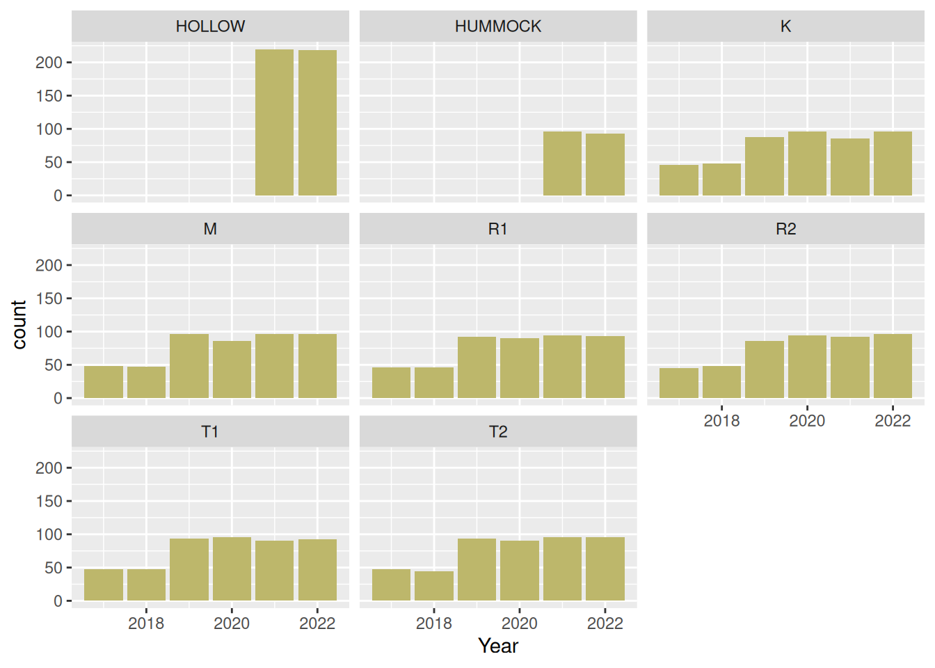 kable_paper()| year | K | M | R1 | R2 | T1 | T2 | HOLLOW | HUMMOCK |